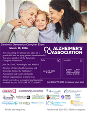 Join Dr. Dave` of Mercyhealth Memory and Dementia Clinic along with the Alzheimer's Association and community partners for this presentation for members of the sandwich generation. Are you caring for a child or grandchild and an aging parent simultaneously? If so, this is for you! Local partner agencies will be present to provide meaningful resources and guidance. Event will be held at the Huntley Library - 11000 Ruth Road, Huntley, IL. Call 800-272-3900 to register for this free presentation.