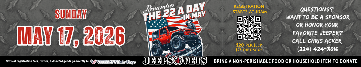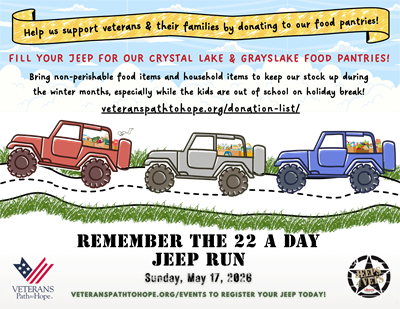 Sponsorship opportunities are available! Donate raffle baskets or items, or become a sponsor of the Jeep Run. Support our local veterans by clicking here: https://givebutter.com/2026MayVPHJeepRun or contact Jennifer Kipp, Director of Development at 815-321-4673 or jkipp@vphope.org.