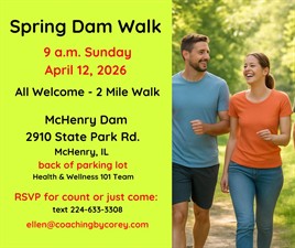 Put a Spring in your step. All welcome to join in the fun at the Dam Spring Walk on Sunday, April 12 from 9:00 -to 10:30 a.m. It is an approximate 2 mile scenic walk on mostly paved ground. There is a modest hill included, but overall, it is considered a moderate level of difficulty.