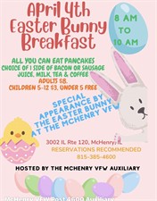 Come out and support our McHenry VFW 4600 Auxiliary. All you can eat pancakes with choice of 1 side of bacon or sausage. Juice, milk, tea and coffee.