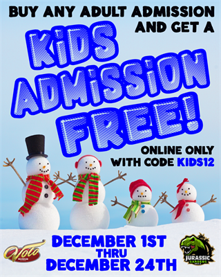 The discount applies to Volo Museum, Jurassic Gardens, and the Titanic Museum. The code will discount one kid’s admission for every adult admission in the cart. Tickets must be used by December 24th; after that date, the free kid’s admission expires, though adult tickets remain valid for up to one year from the purchase date. This offer cannot be combined with any other discount or special event, including the Time Warp Express or Golden December 55+ Platinum Pass upgrade.