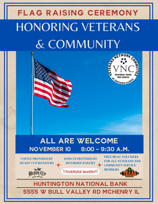 Please join us and Huntington National Bank for a flag raising ceremony for Veterans Day and Chamber ribbon cutting. Coffee and pastries will be provided from McHenry business partners.